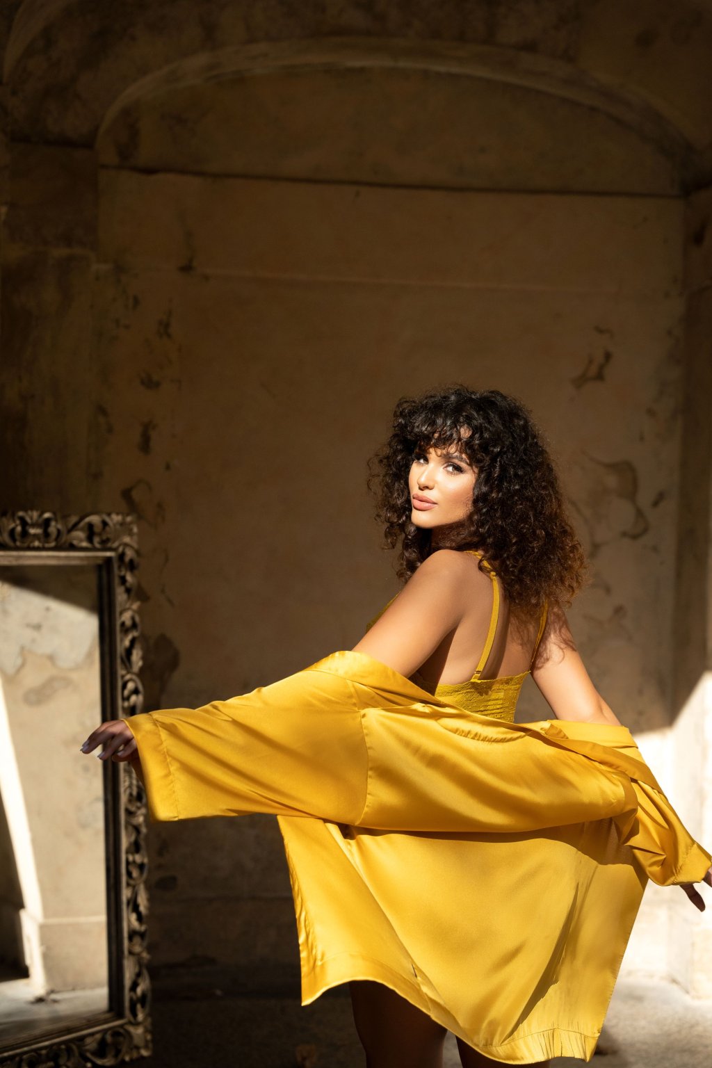 The satin kaftan is a piece you'll fall in love with, perfect for vacations as a cover over swimsuits, for walks in the city, or as a cover instead of a bathrobe over underwear or pajamas.